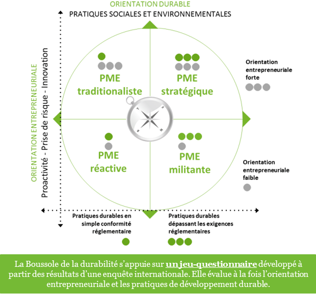 La Boussole TD de la durabilité pour les PME, c’est en fait une matrice qui permet un positionnement selon l’axe de l’orientation durable et l’axe de l’orientation entrepreneuriale. L’orientation durable évalue les pratiques environnementales, sociales et communautaires. L’orientation entrepreneuriale mesure l’attitude envers trois comportements fondamentaux de l’entrepreneuriat.